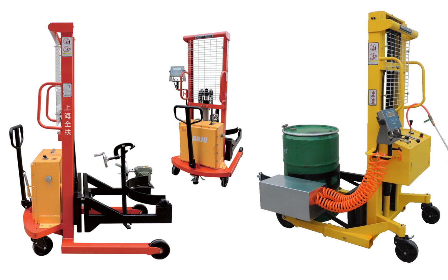 Electric lifting, electric turning or manual turning, manual pushing. After the oil barrel is clamped and lifted, it can turn or stay more than 180 degrees or 360 degrees in the air to achieve full dumping.